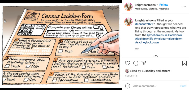 The 2021 Census fell on August 10th, during the 6th lockdown. This Mark Knight comic published in the Herald Sun on August 12th is a comedic take on the questions Victorians were truly thinking about. I thought the QR code with Victorian Premier Daniel Andrews was particularly clever, as the use of QR codes to scan into everywhere we visit has become a quintessential part of our everyday routines. The questions themselves are funny, with the Aussie slang ‘yeh, nah’ being the options for each one. Asking things such as if you have been out of your trackies or house that day are clever questions, because they reflect a universal experience that almost all Victorians could relate to in one way or another.