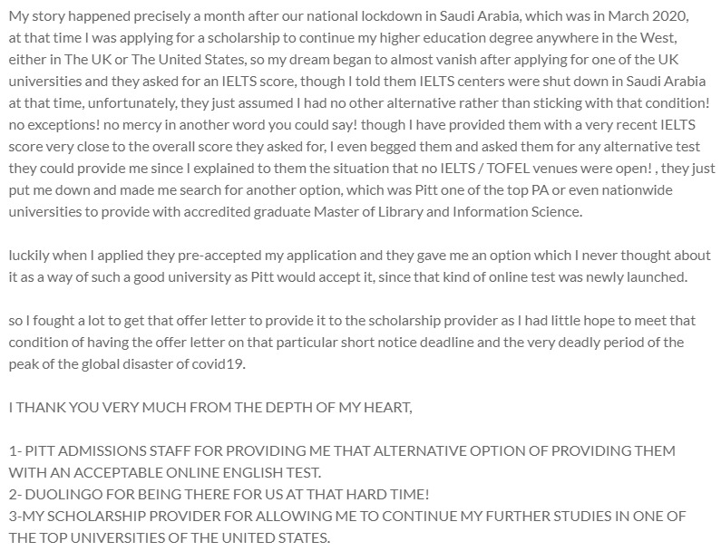 at that time I was applying for a scholarship to continue my higher education degree anywhere in the West, either in The UK or The United States, so my dream began to almost vanish after applying for one of the UK universities and they asked for an IELTS score, though I told them IELTS centers were shut down in Saudi Arabia at that time, unfortunately, they just assumed I had no other alternative rather than sticking with that condition! no exceptions! no mercy in another word you could say! though I have provided them with a very recent IELTS score very close to the overall score they asked for, I even begged them and asked them for any alternative test they could provide me since I explained to them the situation that no IELTS / TOFEL venues were open! , they just put me down and made me search for another option, which was Pitt one of the top PA or even nationwide universities to provide with accredited graduate Master of Library and Information Science.