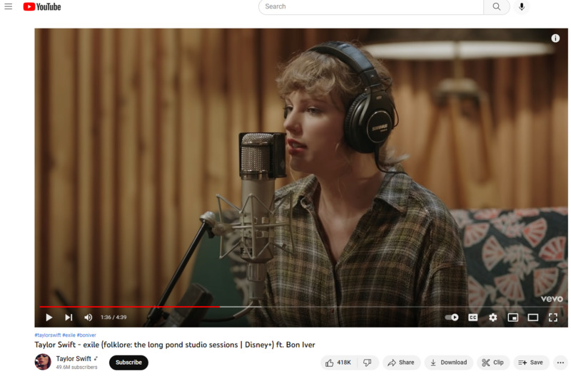 The music video for "exile" shows how music production changed during the pandemic. In the video, Swift and Bon Iver's Justin Vernon are seen sitting in separate home studios, as they never met in person to record the song due to travel restrictions. All the musicians featured are socially distanced and Vernon is wearing a face covering. There are also no special effects, a small budget, and a simple editing style, which stands in contrast to Swift's pre-pandemic music videos.
