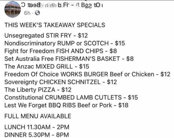 This screenshot of a pub's 'freedom menu' captures the way that people's opinions lockdown measures have been expressed in strange ways. It also highlights the unusual propensity for anti-lockdown opinions to elevate their struggle to that of great civil rights movements of history with their persistent use of terminology like segregation.