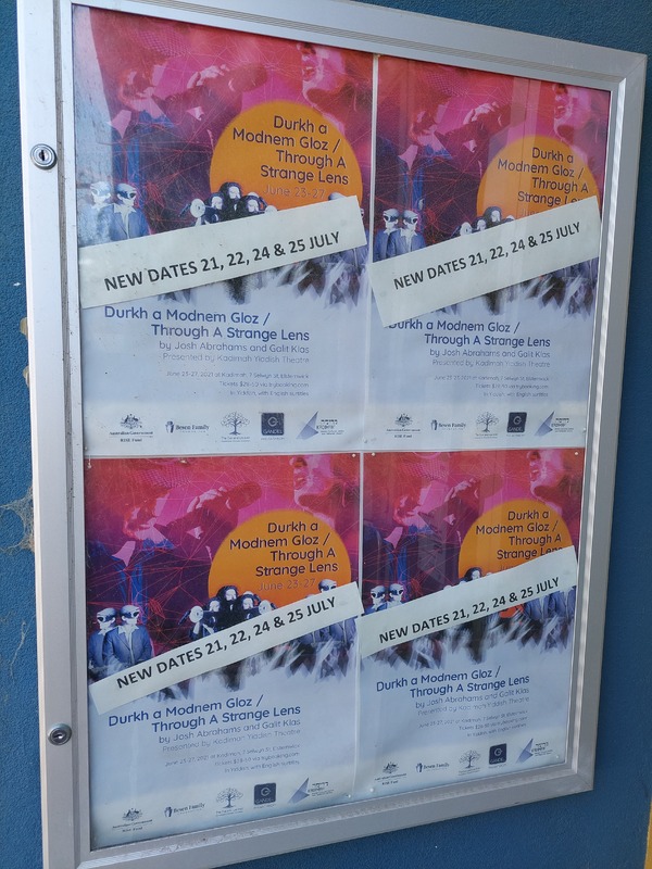 As seen in the first image, the original performance dates were listed June 23-27, but was postponed to July 21-25 due to insufficient rehearsal time, thanks to the lockdown ending 10th June. With a new lockdown coming into effect on Thursday 15th of July, new dates were again required. In the Facebook post on the 21st of July (screenshotted and posted here), the Kadimah Jewish Cultural Centre officially announced the postponement. These new dates were set for August 4-8, but the opening night was the only show performed as Lockdown 6 was announced and came into effect on Thursday 5th. Now with that lockdown finally over, will ‘Durkh A Modne Gloz’ finally get the full season it deserves?
