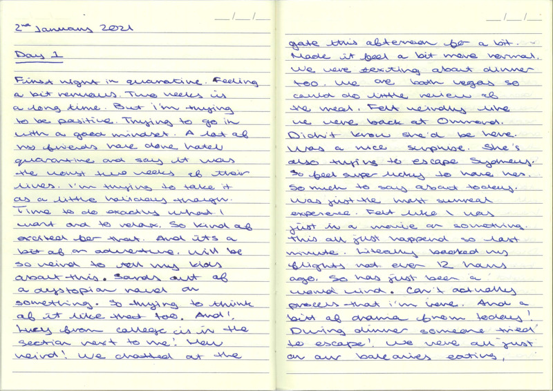 This here is the journal entry I wrote on my first night in 14-day mandatory hotel quarantine at the Northern Territory’s Howard Springs Quarantine Facility in January 2021. At this time, in an effort to control the spread of covid, movement between many Australian states and territories required mandatory hotel quarantine upon arrival. For many, including myself, this process was filled with anxiety and uncertainty. Yet simultaneously, a sense of excitement and adventure. This journal entry gives insight into the complexities of emotions associated with the Australian Covid-19 Hotel Quarantine System.