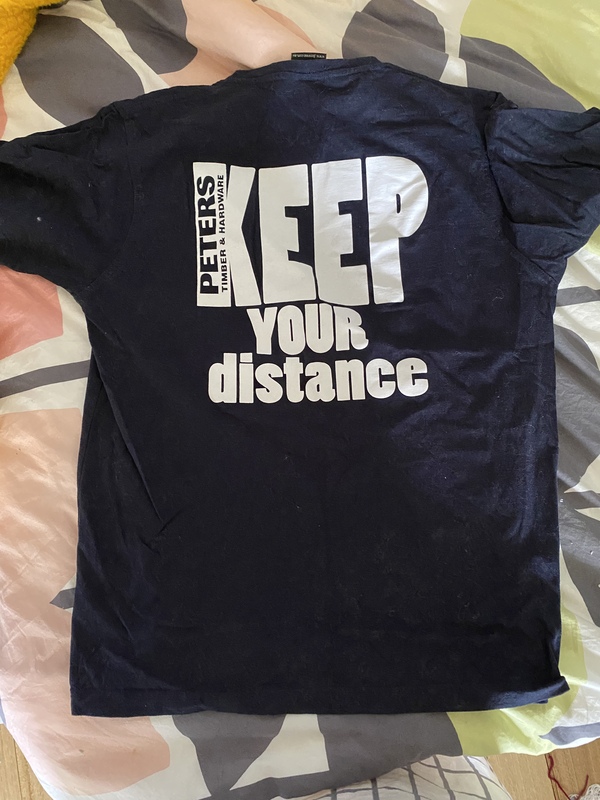 HIST30060: This photo of the back of my work uniform shows how workplaces were affected by the restrictions of the pandemic. Hardware stores were able to stay open to trade customers and for "click and collect" purchases during Melbourne's lockdowns, which meant a change to our normal work routines. Staff were charged with the responsibility of making sure customers wore masks, checked in with the QR codes and practiced social distancing throughout the store. These necessary rules were challenging to enforce sometimes and customers could often be disgruntled and unhappy with these changes. This message on the back of the uniform was in keeping with the atmosphere of working during this period and symbolises our adjustment to "covid normal" practices.