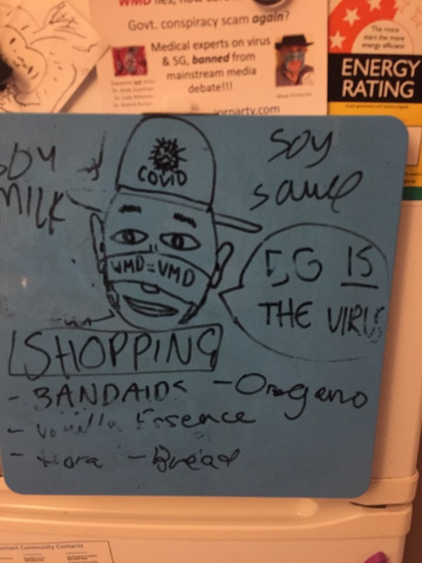 (HIST30060) This photo is of a drawing by one of my housemates of part of a postcard that we received during the first lockdown in 2020. Conspiracy theories surrounding the virus and 5G had just begun to spread during Melbourne's first lockdown, yet my housemates and I felt quite removed from this phenomenon as our social circle mainly consisted of other young, progressive students who were very against these sorts of theories. Receiving this postcard in the mail however, was quite a shock, knowing that people close to us in our area of Melbourne shared these beliefs. Whilst we initially found the image of a man with a hole cut out of his mask humorous, hence the drawing, we were also astounded at the intensity of the covid-scam propaganda. This also marked my first taste of the bitter divide that was to come between pro and anti vaxxers in 2021.