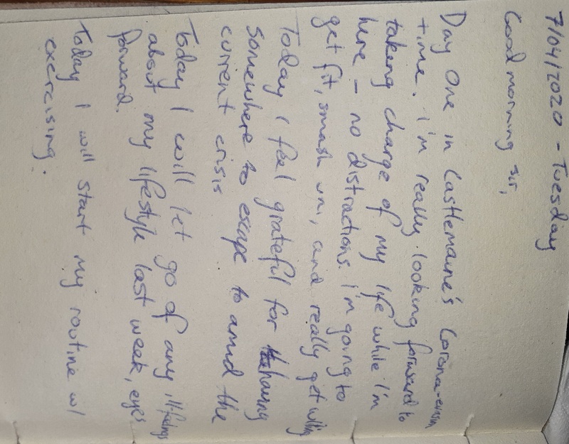 This is a photograph from my first journal entry after lockdown began. It shows what I think was a fairly common welcomed feeling to the lockdown, before we knew how serious things would get. I recall being excited to have some time to focus on writing and exercise without the distractions of work. How quickly those feelings changed...