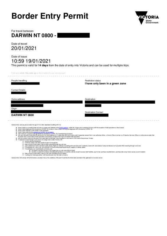 Pictured here is my Victorian border entry permit, issued in January 2021. At this time, due to Australian state and territory border closures, all people entering the state of Victoria were required to hold a government-issued border entry permit. To be eligible for this permit, one had to have spent the previous fourteen days in a so-called ‘green zone’, that is, an area deemed by the Victorian Department of Health and Human Services to be of low COVID risk. Embodied then within this permit is the impact of COVID-19 on the daily lives of Australians. While once able to freely travel, government permission was now required for movement across state and territory borders. These restrictions placed immense financial and emotional strain on many Australians throughout 2020 and 2021, including myself.
