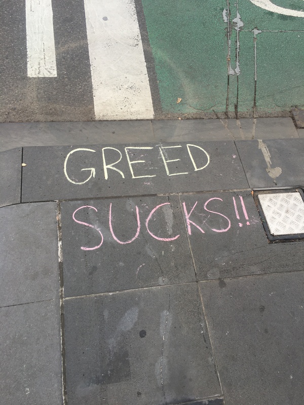 I found this chalk slogan on the road hilariously neo-liberal. Absolutely, greed sucks - the way COVID-19 exacerbated wealth inequalities and ravaged communities disproportionately (due to lack of resources/access and over-policing) sucks. Yet, this chalked slogan was a simplification (or even armchair activist representation) of that reality and this made me chuckle.