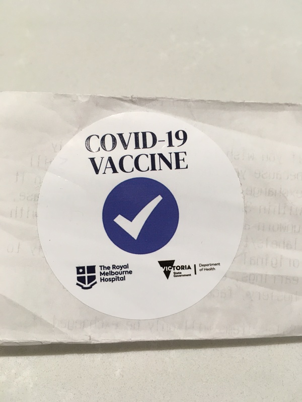This photo is a picture of the sticker that the doctors would give out once you got your vaccine shot. My doctor peeled off the sticker and handed it to me, and I quickly put it on an old receipt in my bag because I wanted to keep it. Outside of the last few years, diseases often did not really play a role in 21st century Australia, but now the sticker shows how some people have a sense of pride around being vaccinated. My partners doctor placed the sticker directly onto his shirt, and he was quite happy to wear it the whole way home. In addition, the Victorian government logo on the bottom shows how the government is endorsing vaccinations for the public. HIST30060.