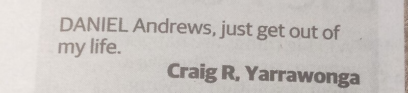 This is a short sentence sent into the Herald Sun newspaper just after another lockdown had been announced, that says quite simply 'Daniel Andrews, just get out of my life.' This sentiment has grown throughout the course of the pandemic, as people feel very frustrated with their freedoms being restricted, if only temporarily. Thus, this item reflects the debate around pandemic restrictions- while some see them as necessary to stop the spread, others question either the need for them or their harshness.
