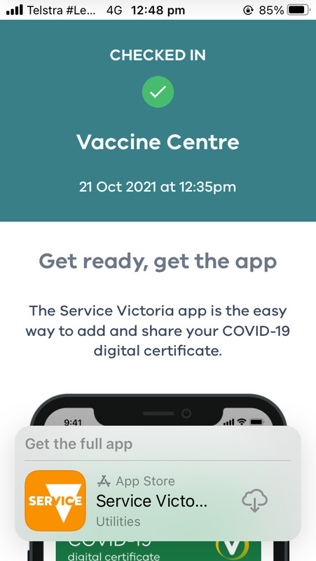 This is a screenshot from my iPhone when I checked into the Melbourne Convention Centre for my second dose of the vaccine. Throughout the Convention Centre, there were several lines with staff directing where to check in, what lines to go into for various brands of the vaccine, as well as a more personal data like ID and Medicare cards. This screenshot shows one of the check points, where staff would direct you to sign in, wait patiently, and then once you showed them the green checkmark, would then allow you to move onwards. At the bottom of the screenshot, there is a prompt directing me to “get the full app” of Service Victoria on my phone, even though I already had it installed. HIST30060.