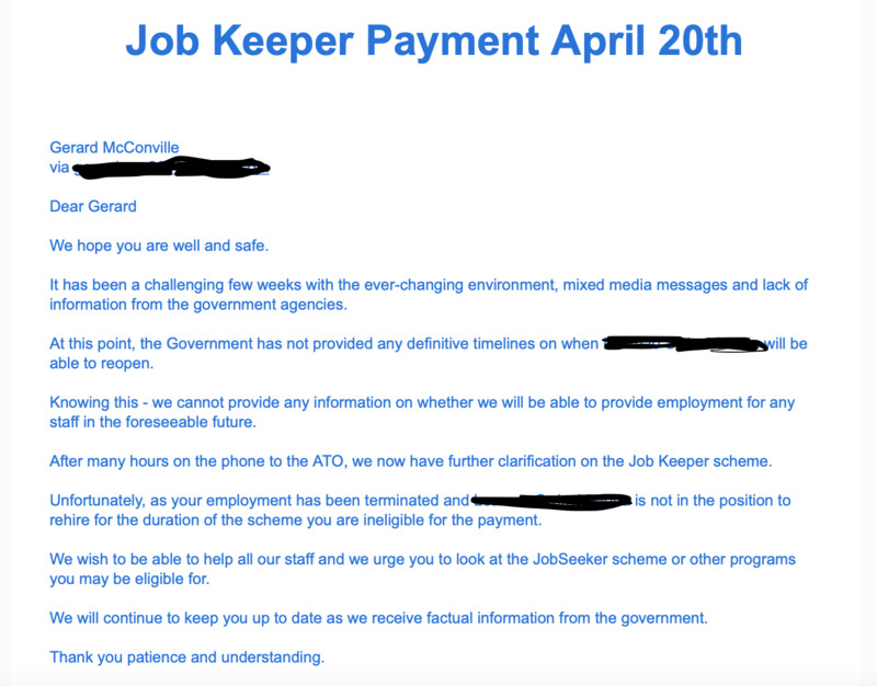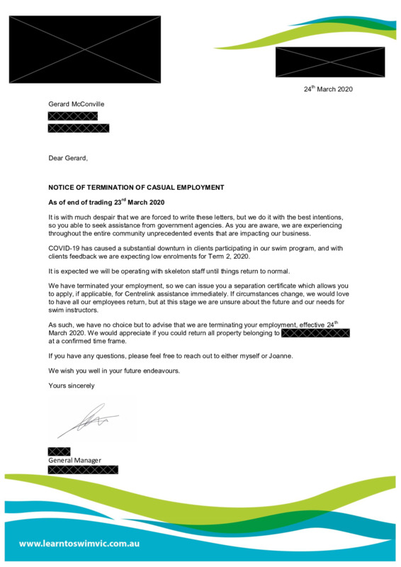 In March 2020, my former place of employment was forced to close down as a result of lockdown restrictions. This was the only communication given to employees about being let go. I had worked at the company for four years at the time from the age of 16 through to the time I was 20. I have redacted some of my own personal information as well as information that could give the company away. The swim school did not manage to reopen at full capacity for almost a year and many staff did not return to the school as they found other employment.