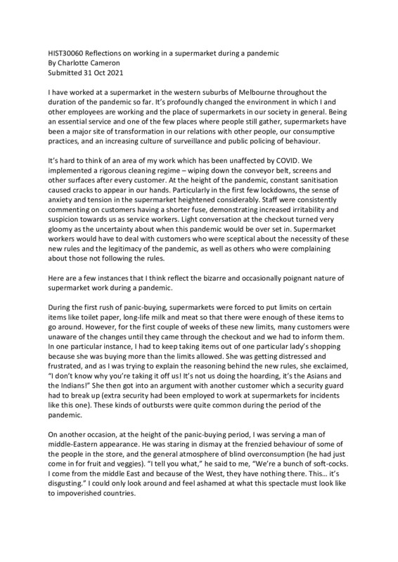 Some reflections on the pandemic from my experience working in a suburban supermarket in Melbourne. I share some general feelings about how COVID changed the environment within supermarkets, as well as several pandemic-related interactions with customers.