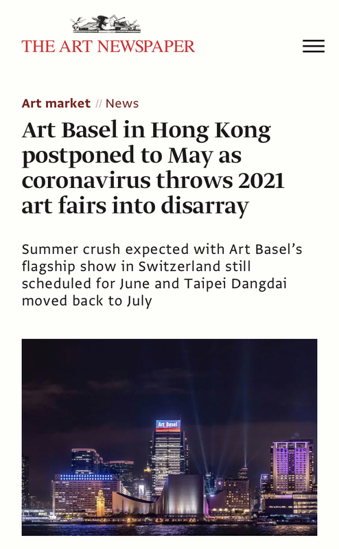 Anny Shaw writes for The Art Newspaper about the postponement of the 2020 edition of Art Basel, Hong Kong. The art fair was previously cancelled in February one month ahead its standard date in mid-March. It was tentatively rescheduled for May 2021 in hopes of vaccination and improvement in daily numbers of contraction and death rates.