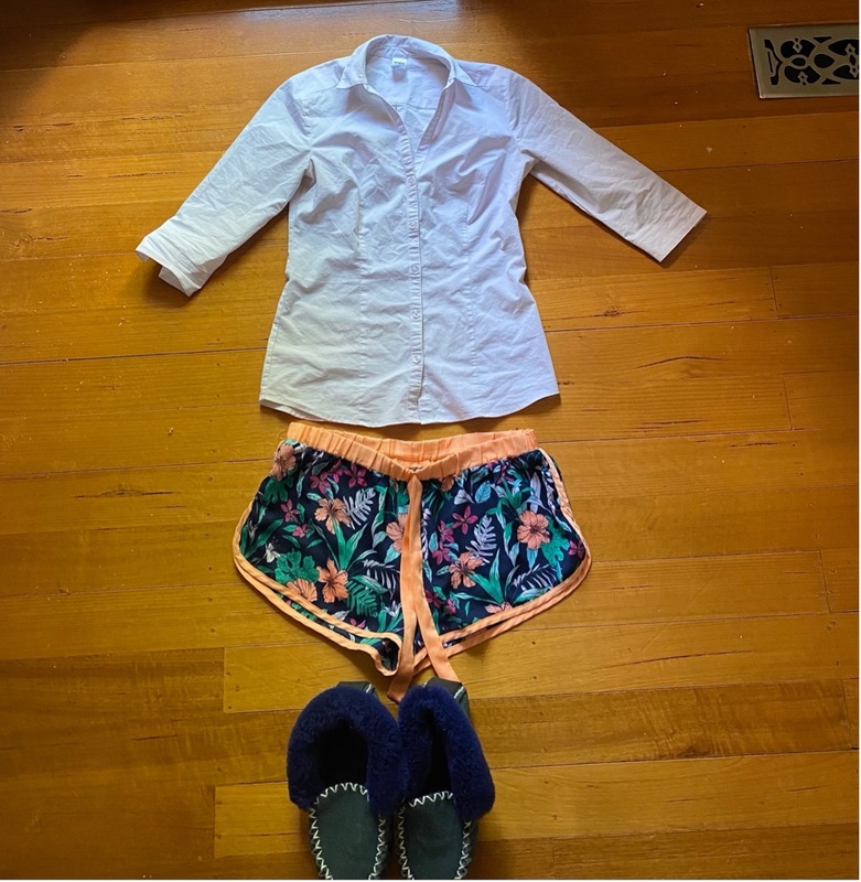 (HIST30060) This is a photo of what I wear during Zoom meetings; a button-up top and pyjama shorts paired with moccasin slippers. Although talking about wearing pyjamas has become somewhat of a cliché during the pandemic, it does not make it any less true. When Zooming with friends and attending online university tutorials, I tend to make an effort from the waist up and opt for comfort from the waist down. I figure if wearing pyjamas all day is one of the small glimpses of joy I can get from an otherwise tough situation, then I’ll take it.
