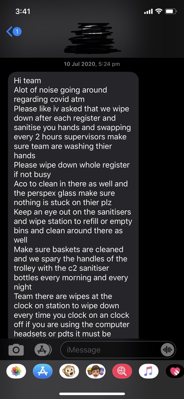 These are screenshots of text messages sent from a supermarket manager to a group chat of service team members of a major Australian supermarket in Altona North, Melbourne. They detail the new cleaning regime that became part of the responsibilities of working in a supermarket during the pandemic. These include instructions about wiping down surfaces with sanitiser and keeping 1.5m distance from coworkers. These texts came a few days after Victoria's third lockdown was announced. I worked at the supermarket at the time and it was an extremely chaotic period, made more hectic by ever-changing restrictions and developments in COVID-safe practices. We would get texts like these quite frequently during this third lockdown because it was so important that supermarket essential workers kept abreast of COVID developments and worked to make supermarkets as safe as possible.