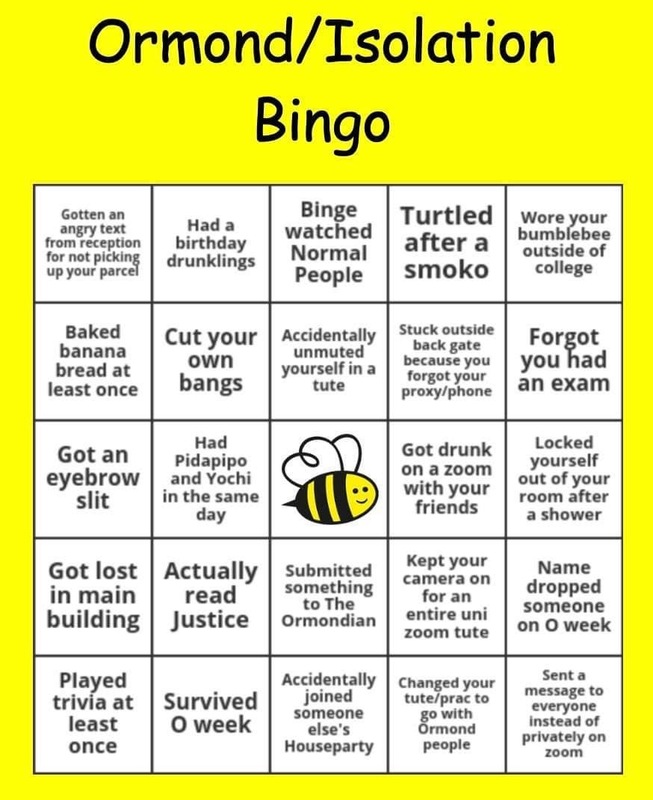 This game of bingo is an example of many of the online activities which were introduced as a form of entertainment during the various lockdown periods. Separated from friends and wider communities for long periods of time, innovative methods were necessary in order to encourage continued connection and interaction. This particular game is targeted towards members of the Ormond community, and refers to a number of specific scenarios that many residents would have experienced. While some are related to a ‘non-COVID’ semester at Ormond (such as ‘Survived O Week’ or ‘Got lost in Main Building’), many relate to the lockdown experience (like ‘Kept your camera on for an entire uni zoom tute’). In reminding readers of familiar scenarios, this seeks to inspire a continued relationship between members of the institution, and to reduce feelings of isolation. HIST30060.