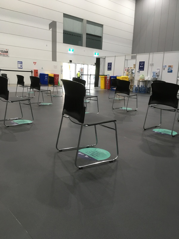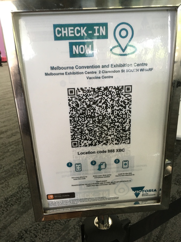 This is a picture of one of the QR codes inside the Melbourne Convention Centre that one had to sign in while getting their vaccine. Each person was directed to pull out their personal phone and sign in individually. There were 2 QR codes to sign into, with staff standing nearby to direct the public in what to do as well as double check the confirmation. The QR code outside of the centre would lead to a short survey, with questions such as “Do you have any symptoms of COVID?” or “Have you been to any of the latest COVID hotspots?” This QR code in particular is to confirm that the person has signed into the physical place of the Melbourne Convention Centre. HIST30060.