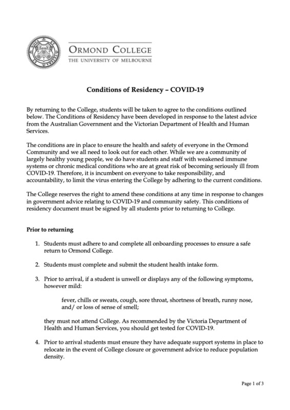 This three-page document is an agreement that all residents of Ormond College had to sign upon their move in at the commencement of 2021. It details a number of expectations of behaviour of all students living on campus– including testing and self isolating when experiencing flu-like symptoms, ensuring social distancing is maintained, and acknowledging that any breach of said conditions could result in being asked to leave the college. Such a document indicates the changing nature of residential institutions, and the systems needed in order to limit the chances of an outbreak. While many of these conditions would have been unimaginable in early 2019, in 2021, many of them were simply seen as the norm for a communal living institution. HIST30060.