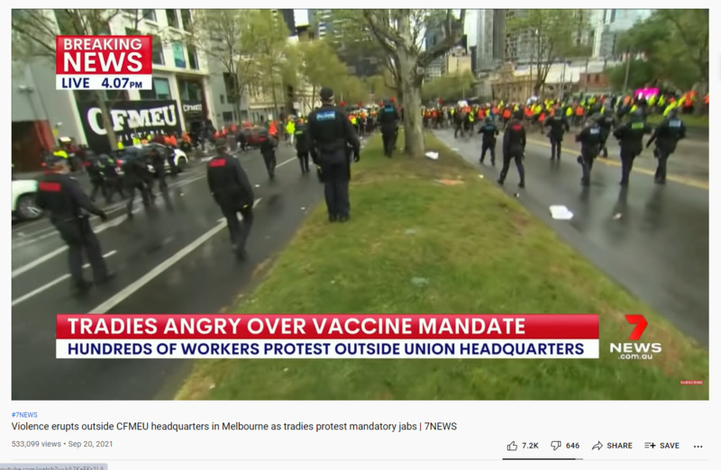 HIST30060. Following a state-wide construction vaccine mandate on the 20st of September, 2021, the CFMEU headquarters was violently ransacked. 'Tradies' or construction workers believed the CFMEU had not stood up for their rights. Violent scenes erupted between CFMEU leaders inside the headquarters and union members who had turned up to protest the vaccine mandate. Many Victorians watched the events unfold on livestream via Facebook and YouTube. Commentators noted that these protests were hijacked by far-right agitators attempting to destabilize the state through protests, especially during a pandemic where large gatherings are considered dangerous and illegal. Ultimately, the Andrews Government responded to the event by shutting down the entire construction sector for two weeks. This functioned as catalyst that pushed thousands of construction workers to protest for many days in the CBD. Ugly clashes between protestors and Victoria Police removed any validity or standing they may have had. Most people in the community heavily criticised those present, especially when other sectors (e.g. retail, hospitality, entertainment) had not been able to work for over 18 months.