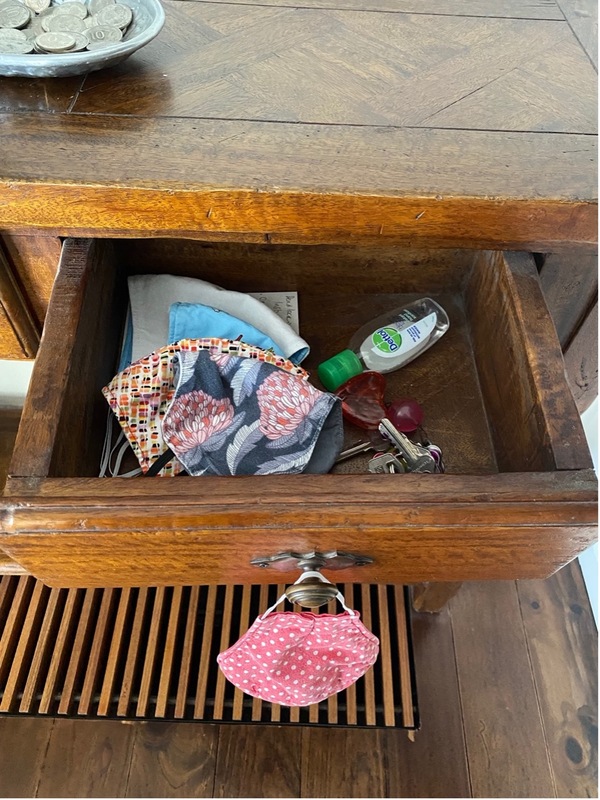 (HIST30060) This photo depicts the contents of my hall table draw which is located near the entrance of my house. Inside the draw are the essential things I can grab before rushing out the door. Prior to the COVID-19 pandemic, the draw was just for my keys, but now (as we can see in the photo) it also houses my family's spare masks and hand sanitiser. I thought this photo was important to share as it captures what I now cannot leave my house without. The mask no longer feels strange or new, instead, it feels like a second skin that I feel bare without.