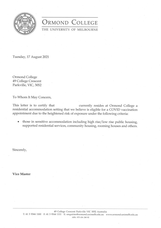 This document is an example of evidence given to students at Ormond College as proof of eligibility for the Comirnaty (Pfizer) vaccine. With a push for widespread vaccination happening in the second half of 2021, there were various reasons for eligibility which were introduced in order to manage the rollout. This letter indicates that an Ormond College resident is eligible due to their residence in ‘sensitive accomodation’ – namely ‘supported residential services.’ Many identical letters were distributed to students in order to encourage vaccination, and thus reduce the chances of a serious outbreak on campus. HIST30060.