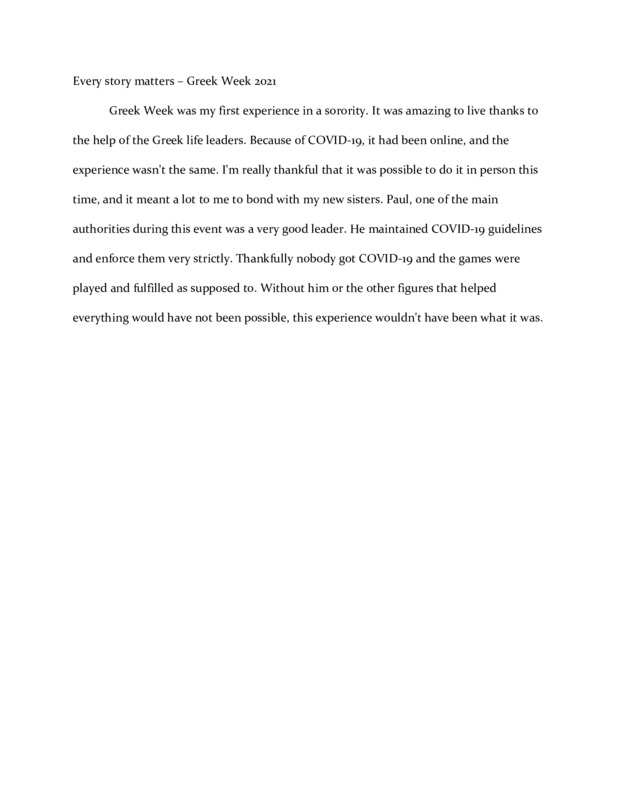 Greek Week was my first experience in a sorority. It was amazing to live thanks to the help of the Greek life leaders. Because of COVID-19, it had been online, and the experience wasn't the same. I'm really thankful that it was possible to do it in person this time, and it meant a lot to me to bond with my new sisters. Paul, one of the main authorities during this event was a very good leader. He maintained COVID-19 guidelines and enforce them very strictly. Thankfully nobody got COVID-19 and the games were played and fulfilled as supposed to. Without him or the other figures that helped everything would have not been possible, this experience wouldn't have been what it was.