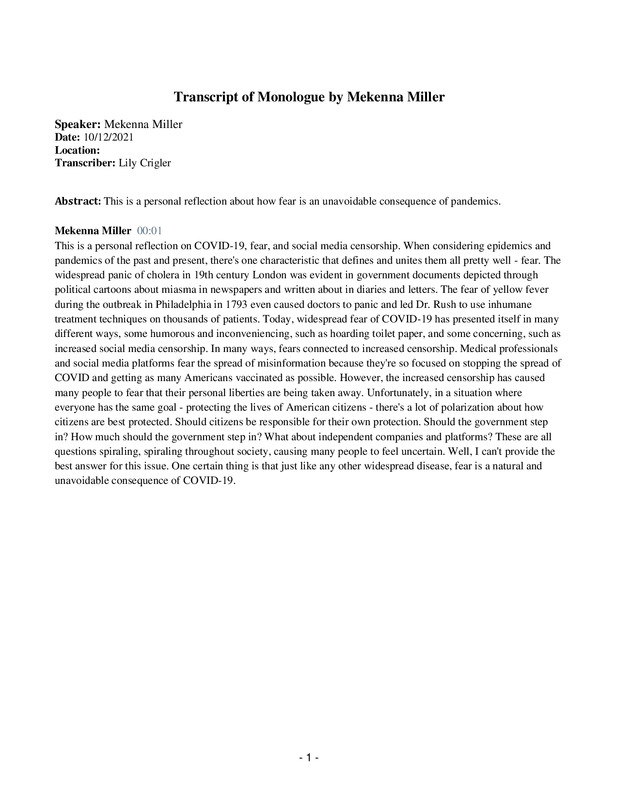 As someone who has studied the history of disease and epidemics, I know that disease causes widespread fear and panic. The uncertainties and unknowns of disease cause people to question themselves, others, and even medical professionals. Sometimes, questioning and being skeptical is what saves lives. For example, questioning Dr. Rush's treatment methods in the yellow fever epidemic of Philadelphia or questioning miasma theory during the outbreaks of cholera in London. Recently, there have been cases of blood clots as a result of the Covid-19 vaccine. This is a screenshot of what WHO has to say about the blood clots and a comment from myself. While I would love to get the vaccine, and I was originally hopeful about getting it, I'm too scared and unsure what to do. Although WHO says cases of blood clots are rare, there are still many people like myself who are skeptical and only want to make the right decision for their own health and life. With talk of possible mandated vaccines, I am uncertain about what the future will look like for me and others like me.