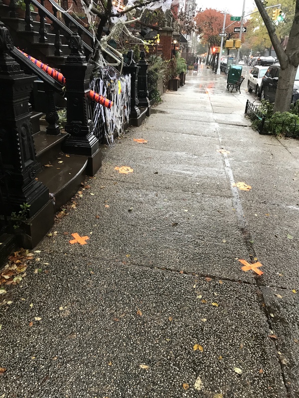 This image shows Xs marked in tape on a sidewalk outside a brownstone in Park Slope, Brooklyn. The owner(s) of the home marked the spot for each child to should stand in order to remain socially distanced when trick-or-treating.