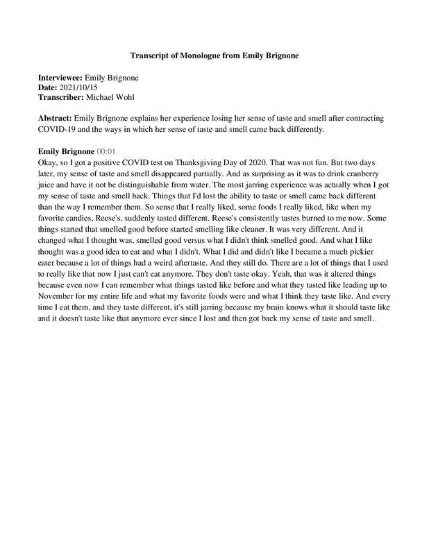 2. Description: Among the most commonly observed effects of Covid-19 on patients are deteriorations (temporary or permanent) of taste and smell (Dell’Era et al. 2020, p. 1591). During the Italian Covid-19 outbreak in 2020, Novara University Hospital conducted a cross-sectional study examining the extent of smell-and-taste related disorders among patients confirmed to have contracted the virus. Results from the study suggest that an overwhelming share of patients experience sharp alterations in both senses, the severity of which differs from subject to subject. While extreme symptoms disappeared a fortnight after subjects participated in the study, a portion of respondents reported lingering sensory effects resulting from the virus (Dell’Era et al. 2020, pp. 1591-96).