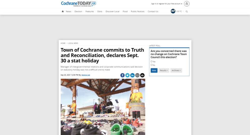 This is a newspaper from Cochrane Today, a subsidiary of the Cochrane Eagle on the adoption of the National day of Truth and Reconciliation in the town of Cochrane. The document talks about how other municipalities and even the provincial government have chosen not to participate in the first day of this incredibly important national holiday.
