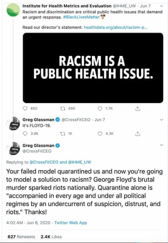 Amidst Covid-19, the documentation of the police killings have been manifested into comparisons with the world-wide pandemic. These comparisons reflect the ongoing disparities between Black Americans and systemic racism. The Institute for Health Metrics and Evaluation takes to Twitter to try to support this comparison but faces a backlash from a fellow BLM support who argues that the comparison is invalid based on the different progress the BLM protest and quarantine had made. I felt like this was important for me to post because I feel like it shows an effort from BLM supporters to combat the racism within our culture by arguing that society must view and address racism as a public health issue. Yet, the tweet continues to evolve as ironic as the lack of regards Americans have for coronavirus policies and laws continues to grow everyday. Base on how events go, we might regard the validity of this statement to be false down the road.