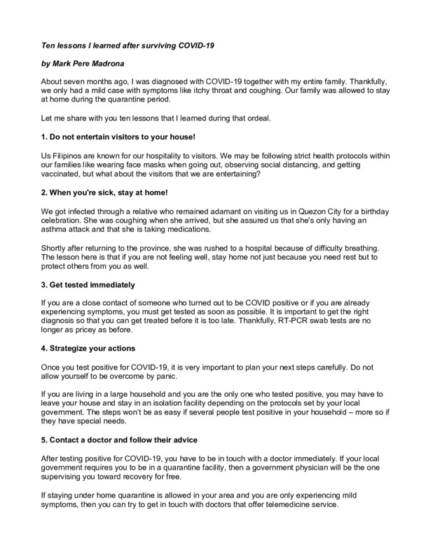 In the article, I talked about my experience when I and everyone else I was living with had COVID-19 last March. I am sure that your readers will find this story relevant especially given that the pandemic is still ongoing.
