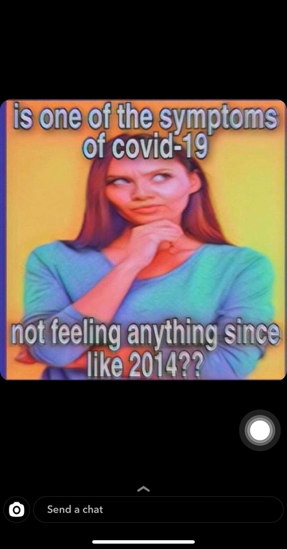 When the pandemic first broke out out, many people didn't know what to think. In millennial and gen z fashion, many young adults turned to the internet to crack jokes and voice their opinion about the upcoming crisis. This meme pokes fun at the uncertainty of the viruses' signs and symptoms many medical and governmental officials had at the beginning of the pandemic. The mem also pokes fun at the idea of teenage angst and anxiety a rapid number of young adults are starting experience more and more during this recent decade. The pandemic may cause your nose and mouth to not feel anything but the real question is if young adults are really "feeling" the impact of what is going on? A Forbes report in April of this year has indicated that young people between the ages of 18-24 are starting suffer from more mental health problems than any age group since the pandemic started. Think what you will but this study definitely proves that more young adults will suffer long lasting effects of pandemic during and after the global crisis comes to a end. I liked this meme because it a representations of some of my numbs feelings I have had during this pandemic.