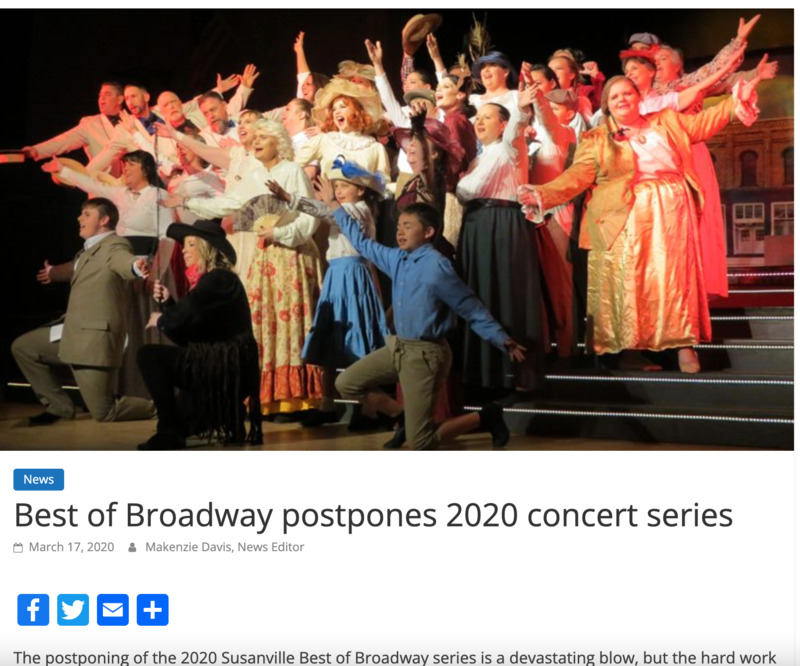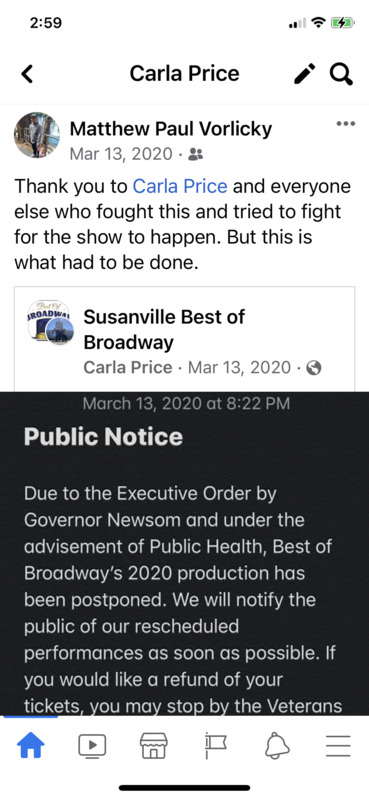 When the global pandemic hit, we were just a day away from putting on a theater production that we had worked on for a year and over 10 weeks of rehearsal. As a board, we thought of every possible way to keep a show, so that it wasn't shut down. I went and measured the venue, the local Veterans Hall to see how many seats we could have in the hall, if they were six-feet apart. We looked at requiring mask or limiting to just family. We met with local public health officials with different options on how to keep our show. But, the final decision was that it was in our best interest to cancel the show. The concern was that with family coming in from other areas, that Best of Broadway could be responsible for bringing Covid-19 to Susanville, and we were not willing to take that risk. When we cancelled, we figured we just needed to reschedule the show a couple of weeks. That, in and of itself was challenging. But the idea of a possible lawsuit or worse causing harm to others was a real possibility. As the Board President, I had to announce via Facebook and Instagram that the show was cancelled. It was terrible. A very sad day for our Broadway family. This post was from one of the husbands of our performers. His words of encouragement was reassuring. Most people responded in a sympathetic and understanding way.
