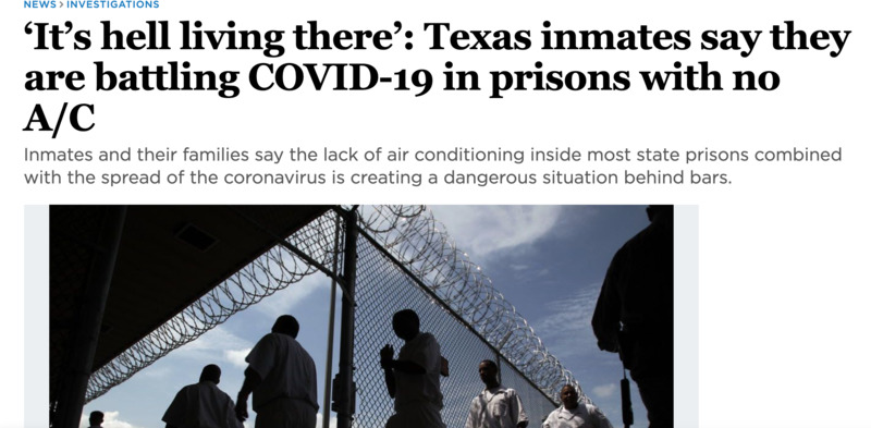 One of the examples of bigger issues coming to light during the pandemic. Not only were people in prisons fighting covid, but they're also continually dealing with a lack of resources such as basic air conditioning/ heat.