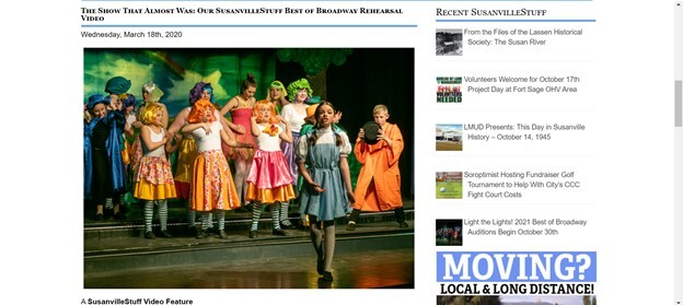 After Susanville's Best of Broadway show was cancelled just a day before its opening night, Susanville's local online news editor Jeremy Couso reached out to the Best of Board members to see if he could publish an article about our show, the show that never happened. He and his wife attends the performance for a media night and he happened to have a video of the show. For a small production, the youtube video of the performance has had just under 900 views as of October 9th, 2021. I directed Wizard of Oz with a dear friend of mine, in a one year shot to direct. Watching the video of the show that didn't happen is honestly very sad and hard to do. We become family with the cast and to not reach the finale is painful. But the show must go on, and in 2022, Best of Broadway will take the stage again.
