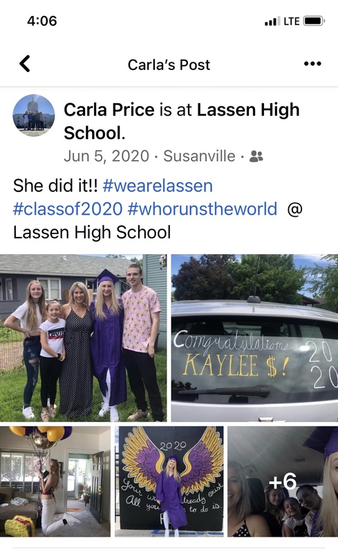 High School graduation 2020 was one for the books for sure. My daughter was a part of the class that had to deal with all of the concerns about what graduation would look like. Our high school decided to have a graduation parade. For my daughter, this was the best possible way to have a graduation. My daughter, dressed in her graduation regalia and her brother, two sisters, and myself crammed into my little car and in a procession, joined a hundred other cars for Lassen High's graduation parade. We decorated the car and honked the horn as we drove by community members lined up on the streets. Teachers were stationed all along the parade route and waved at the students, they had not seen in months. The enthusiasm was contagious. Having a girl that has social anxiety, for her, sitting by mom in the car was the best feeling. As she got out of the car to walk up the stage, she was able to thank the school counselor who invested hours to help her graduate. It was certainly a graduation to remember, and hands down, my favorite graduation to attend.
