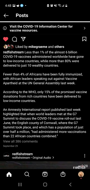 A post from the RedFishStream Instagram page, which details the ways in which the West has dominated vaccine production and distribution, resulting in a disparity between available vaccinations for overexploited nations, particularly in Africa. Largely, this can be traced to patent restrictions either for medical equipment, or for the vaccines themselves; which make producing these vaccines almost, and if not impossible for these nations.