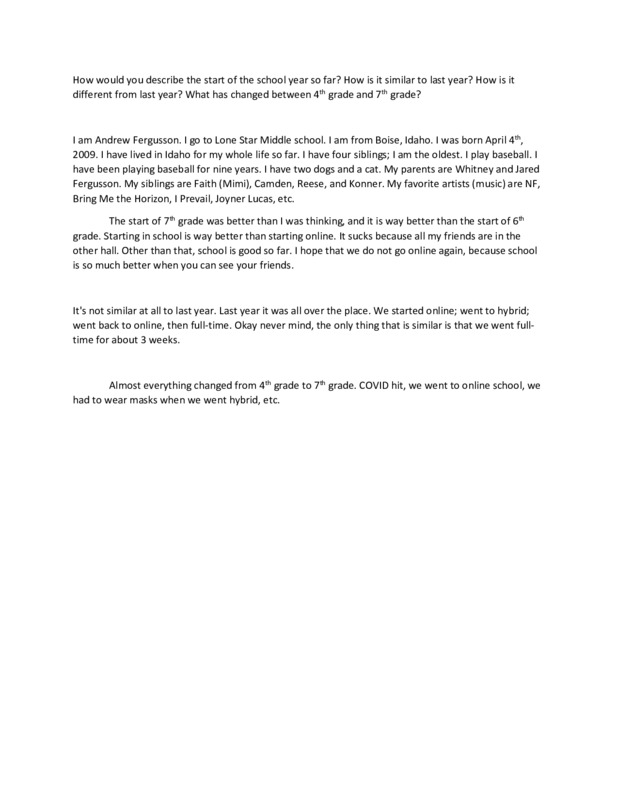 There are somethings that changed between 4th and 7th grade because during 5th grade we were almost done with the school year but then covid hit and we had to do online for the rest of the school year. Then in 6th grade at the beginning of the school year we were doing online for a long time, and it was not helping a lot because I really could not ask questions about the assignment we are doing and about the lesson.