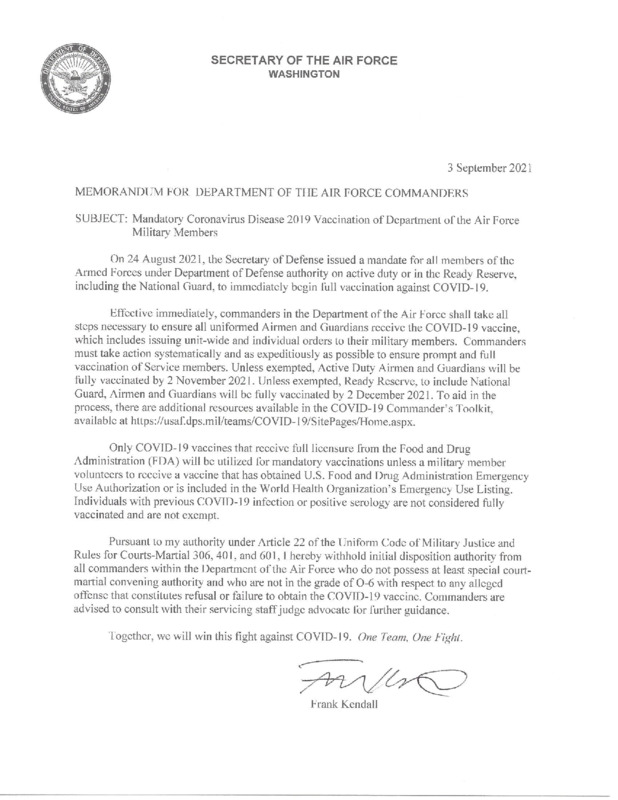 Attached is a letter from the Secretary of the Air Force that mandates all Air Force and Space Force members must be vaccinated for the Coronavirus Disease by 2 November 2021.