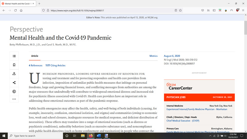 Uncertain prognoses, looming severe shortages of resources for testing and treatment and for protecting responders and health care providers from infection, imposition of unfamiliar public health measures that infringe on personal freedoms, large and growing financial losses, and conflicting messages from authorities are among the major stressors that undoubtedly will contribute to widespread emotional distress and increased risk for psychiatric illness associated with Covid-19. Health care providers have an important role in addressing these emotional outcomes as part of the pandemic response.