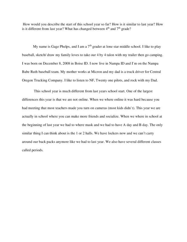 I would describe the start of this school year as, very stressful, difficult, and boring. It’s not similar at all. And what’s different, is probably almost everything we don’t have to wear masks anymore and we don’t have to wipe our desks down after the period, we go back full time now no more a day b day, no more hybrid, no more Wednesdays off. A lot has changed but it is still manageable, like we must use hand sanitizer and we must be careful of everything we do. Its very different than what it used to be when it was the 4th quarter of 5th grade. During then we had to go full online because there was the covid outbreak. Then in 6th grade we were pretty much all online for most of the year but then at the very end we went back to school with masks mandatory. But then this year, (7th grade), we are back to school full time with masks optional.