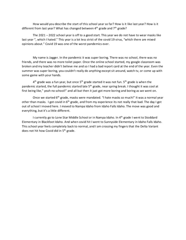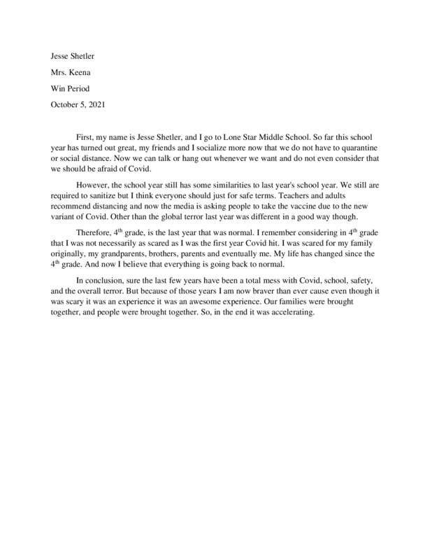 My name is Cardin Madera I go to Lone Star Middle School, and I enjoy school. I would describe the start of this school year weird because it has been a long time when I last went to a full year of school and I am not into the routine yet, so it makes it weird. Last year is similar because we still must sanitize our hands to keep us safe. Also, the staff are still not messing around about Covid-19. If you were to tell a joke about Covid, “saying this kid has Covid” and it is a lie you would get in trouble. It is different than last year because we do not have to sanitize our hands as much. Then we get to have our masks off the entire day if you want and it is not like we have half of the school students at school and the other half at home.
