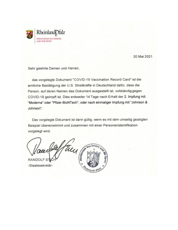 The attached is a letter from the Rheinland-Pfalz state secretary that explains and validates the COVID-19 Vaccination Record Card that the CDC gives out with vaccinations. Many US military members in Germany received the vaccine, but our vaccine cards were not recognized by local German establishments as German and other European vaccine cards looked very different.