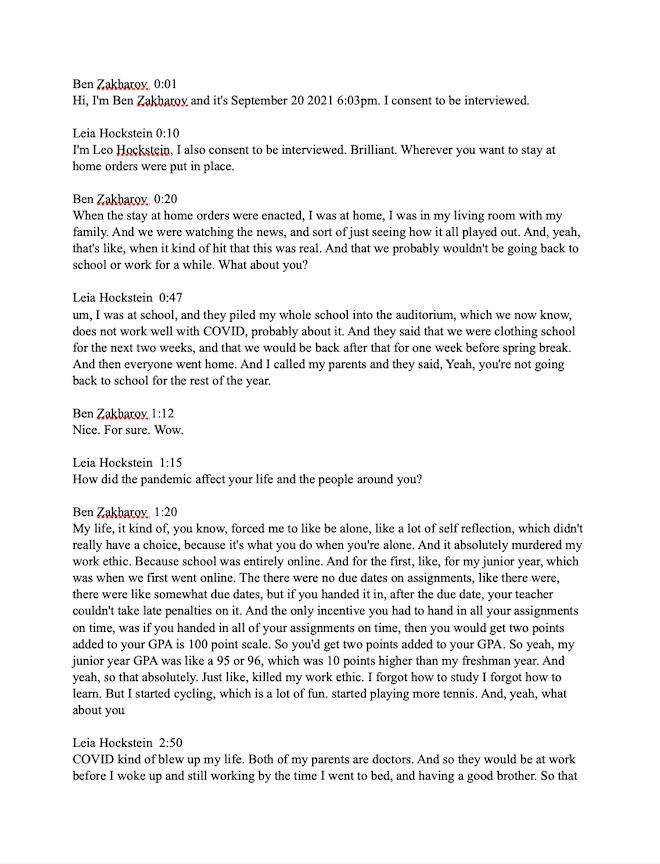 A classmate and I interviewed each other about our first-hand experiences with COVID-19 in the past year and a half.