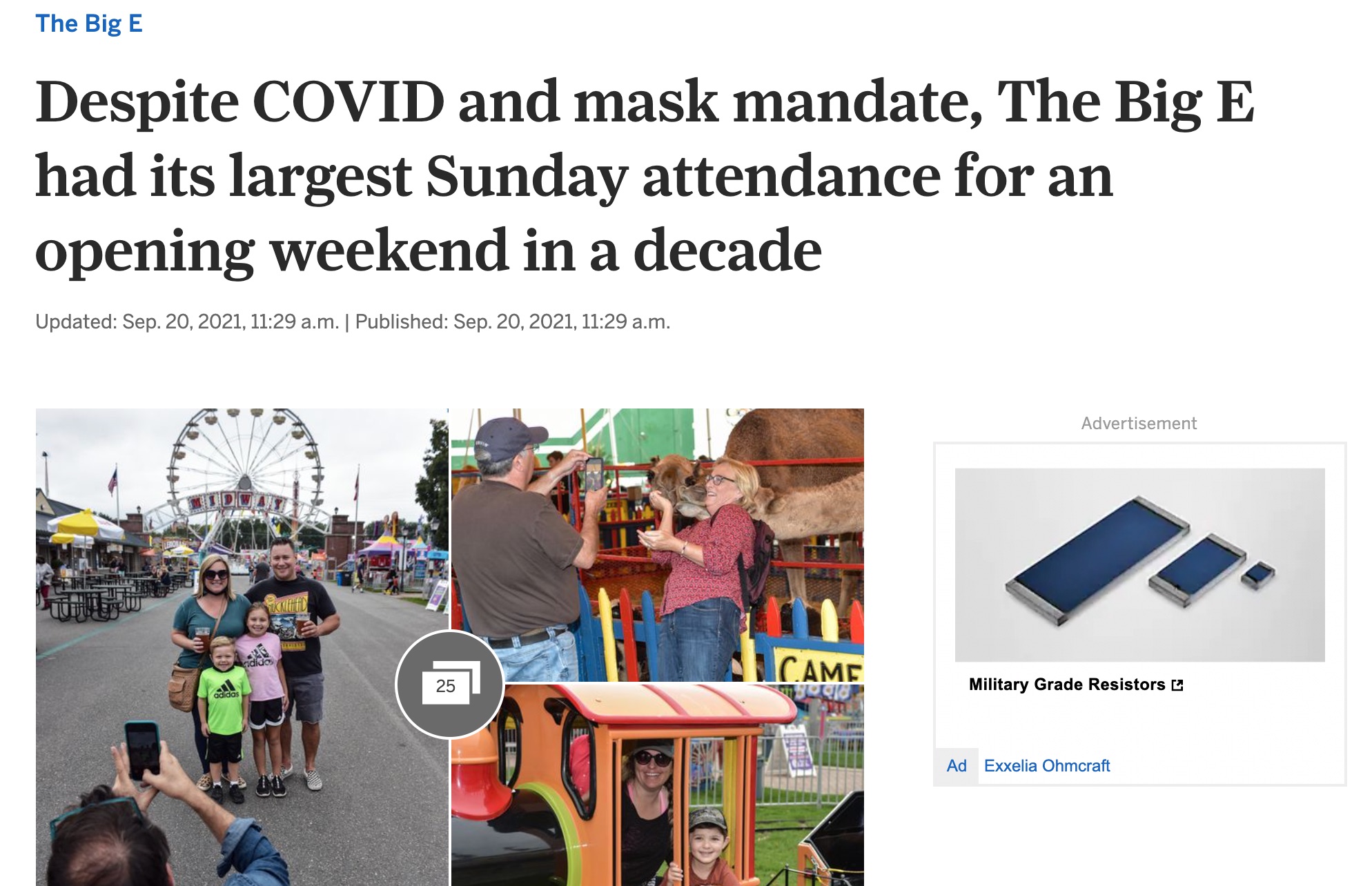 This article reports on the crowds on the third day of the Eastern States Exposition. Commonly referred to as the Big E, the Eastern States Exposition is a New England fair held at the end of September in West Springfield, Massachusetts. It was cancelled in 2020 due to the pandemic, and town residents have concerns about the Big E in 2021.
