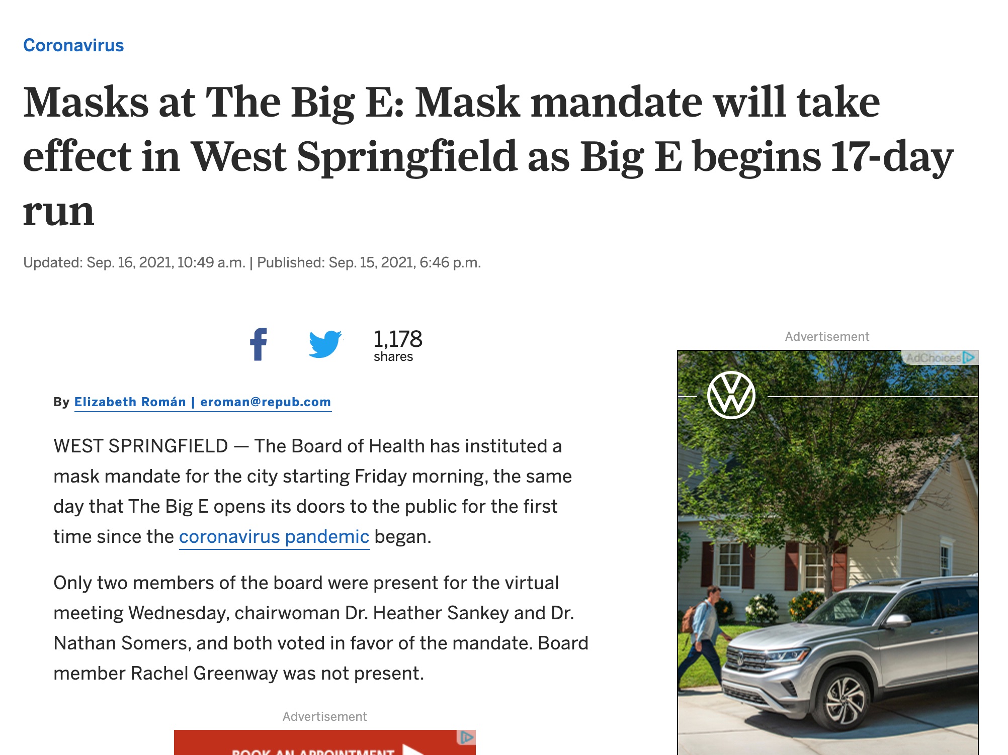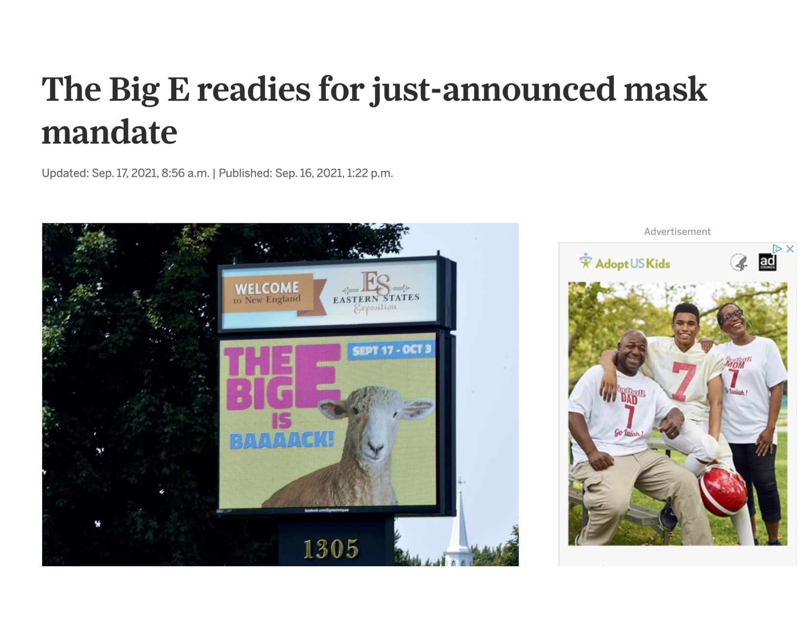 This MassLive article reports on the Big E's reaction to the newly instated mask mandate in Massachusetts. The Big E, or the Eastern States Exposition, is a New England fair held in West Springfield, Massachusetts, annually. It was cancelled in 2020 due to the pandemic.