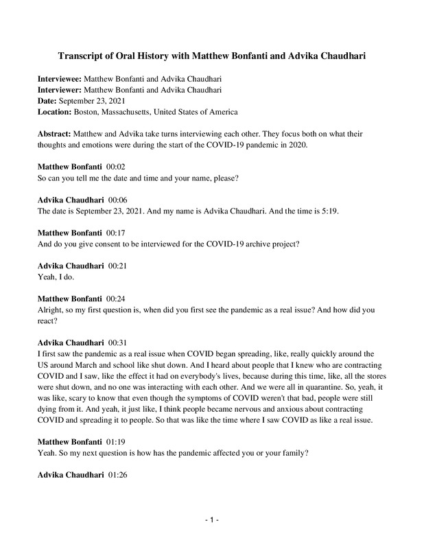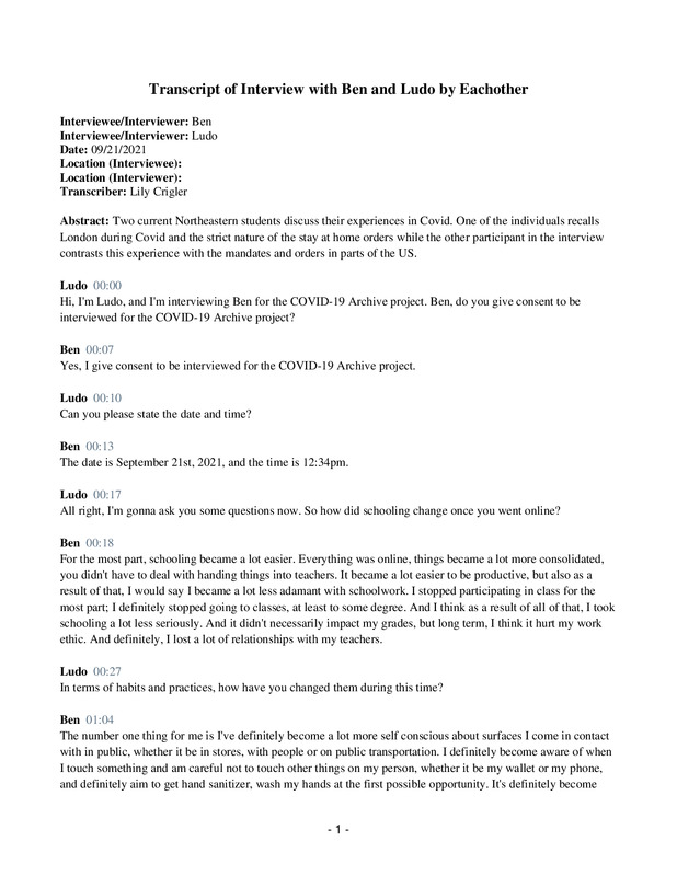 This is an interview between two Northeastern University students on how Covid-19 that shared their thoughts about the impact of Covid 19 both personally and globally.