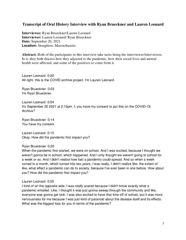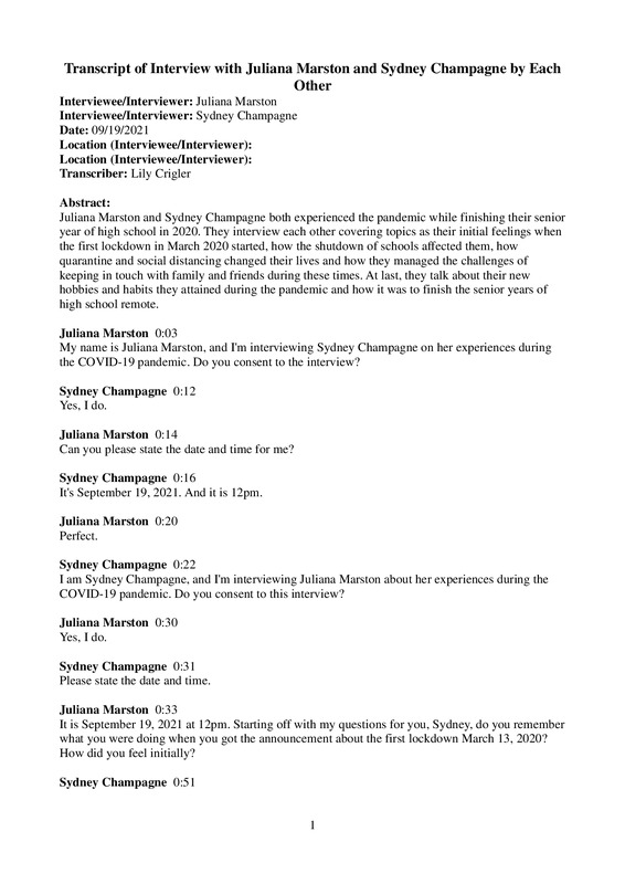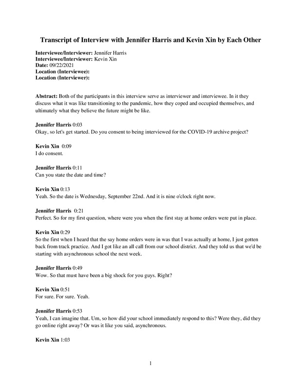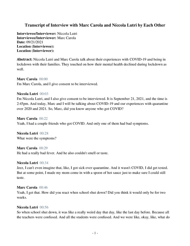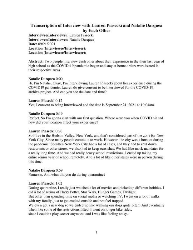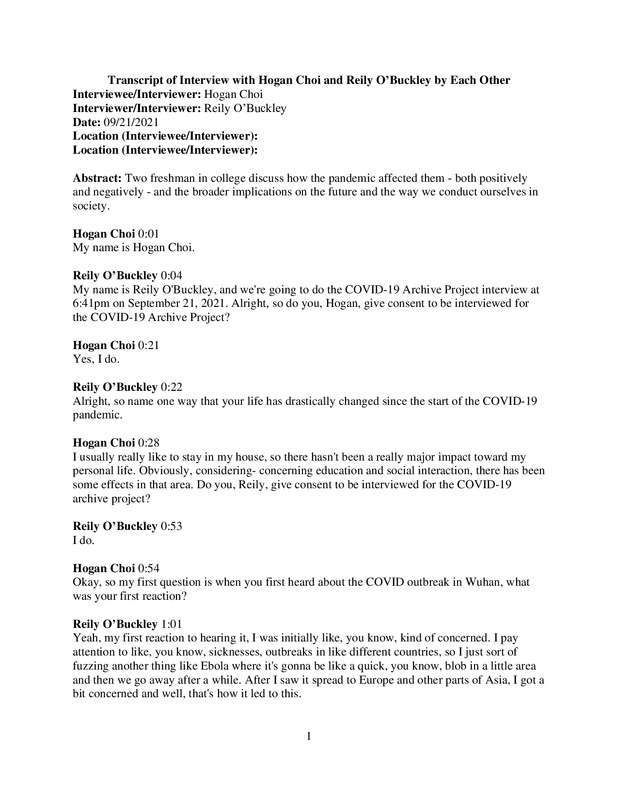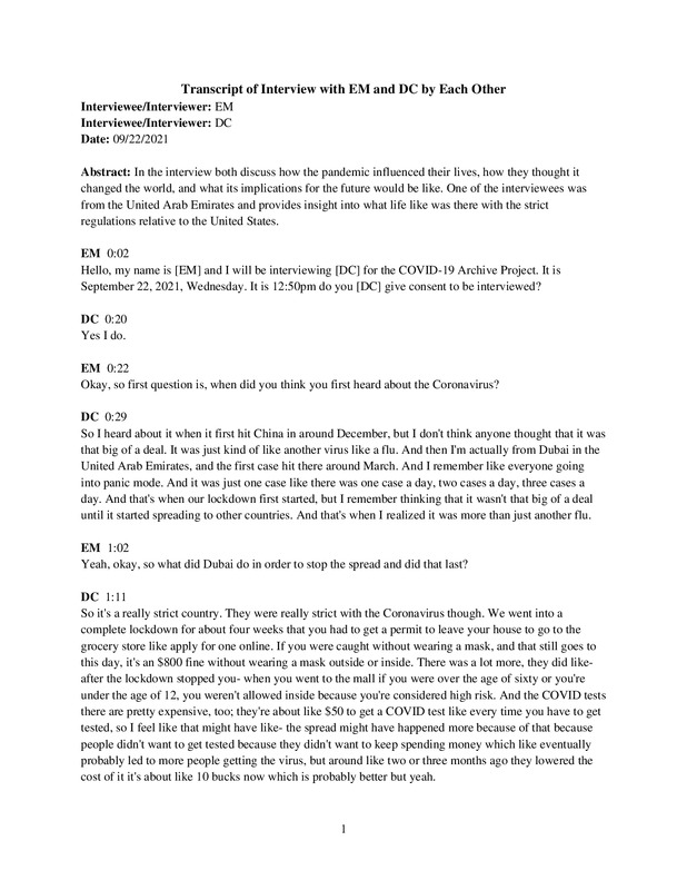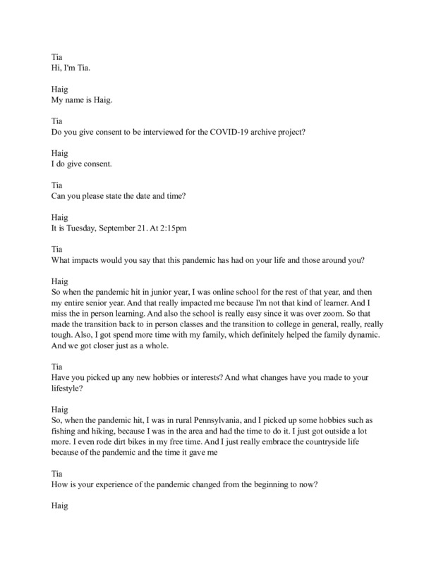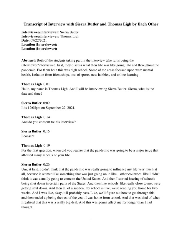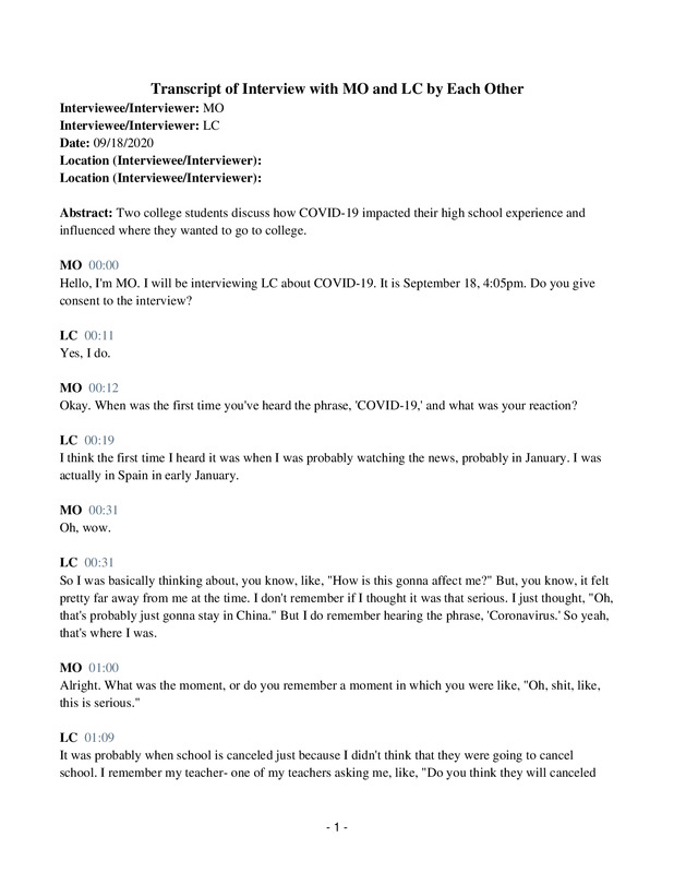 Interview between two first year college students who have felt the effects of COVID-19 in their every day lives, with a focus on how it has affected their learning experiences in school.