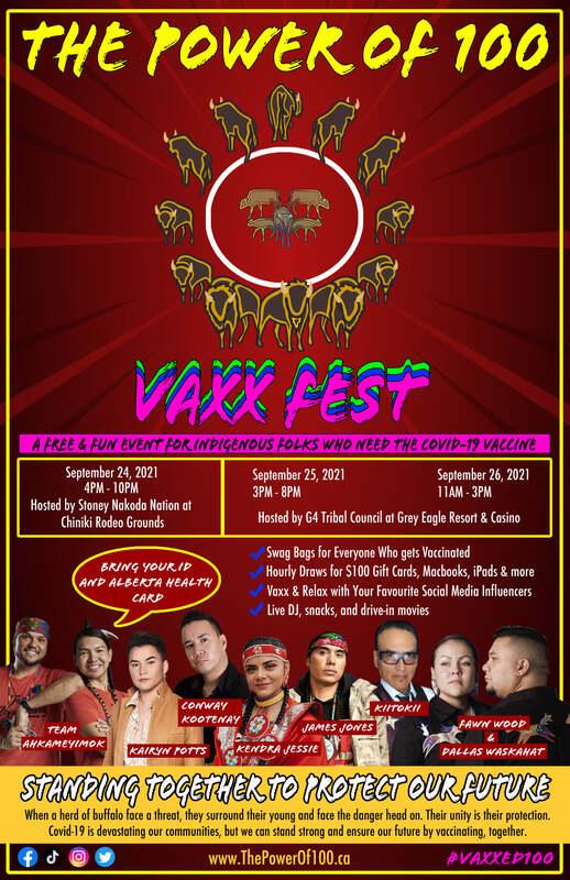 Shared in Facebook by Tsuutina Comm. The poster is directed at indigenous people in the Canadian Province of Alberta. It advertises three days of events (24-26 September 2021) that those who get vaccinated at the event will also receive a swag bag; that there will be draws for gift cards, Macbooks, and iPads; social media influencers present; live music; drive-in-movies; and food.